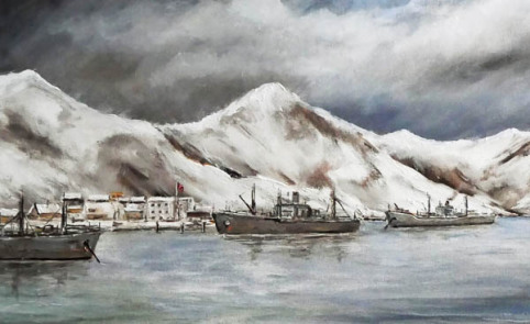 Nach Erzählungen und Tagebuchaufzeichnungen des damaligen Kommandanten Kptlt. zur See, Dr. Hans Georg Hess von Marinemaler Lukas Wirp ausdrucksstark umgesetzt. Von der Marineführung auf einen Nordmeer - Konvoi angesetzt, treffen sich die Boote U995 und U668 in abendlicher Stimmung. Kommunikation unter anderen mit Einsatz von Morse - Signallampen.
