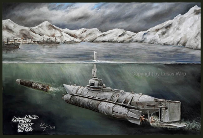 Ein extravagantes U-Boot Motiv des Kleinst-U-Boot Biber im Angriff. Marinemaler Lukas Wirp hat hier eine ungewöhnliche Schnittperspektive gewählt, so dass man sowohl die Über- als auch Unterwasserstimmung sehen kann. Hier dargestellt ein Angriff auf Kriegsschiffe in Norwegen Winter 1944.