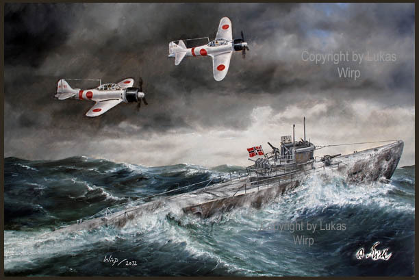 Das Gemälde entstand im persönlichen Gespräch mit Ritterkreuzträger und Kommandant Kapitänleutnant Alfred Eick und dem Militariamaler Lukas Wirp. Es zeigt U510 bei der Begrüßung durch japanische Zero Jäger in den Gewässern vor Penang. U510 war eines von insgesamt vier Monsum Booten der Klasse IX C, die in den asiatischen Einsatzraum verlegt wurden. Dabei gelangte Kaleu Eick mit seinem Boot auch bis nach Kobe in Japan.